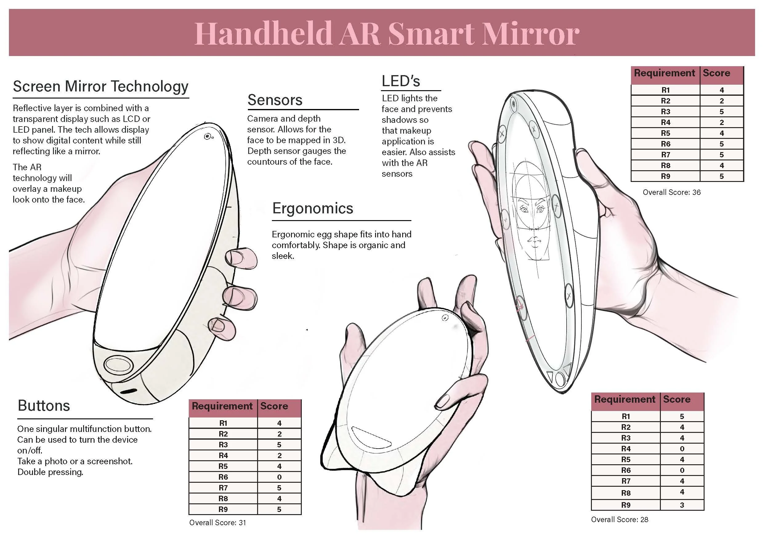 Reflecta is a compact handheld AR smart mirror that uses a transparent display, depth sensing cameras, and AR overlays for virtual makeup try ons and skin analysis. The aim was to move beyond concept work and deliver a design ready for manufacture.
