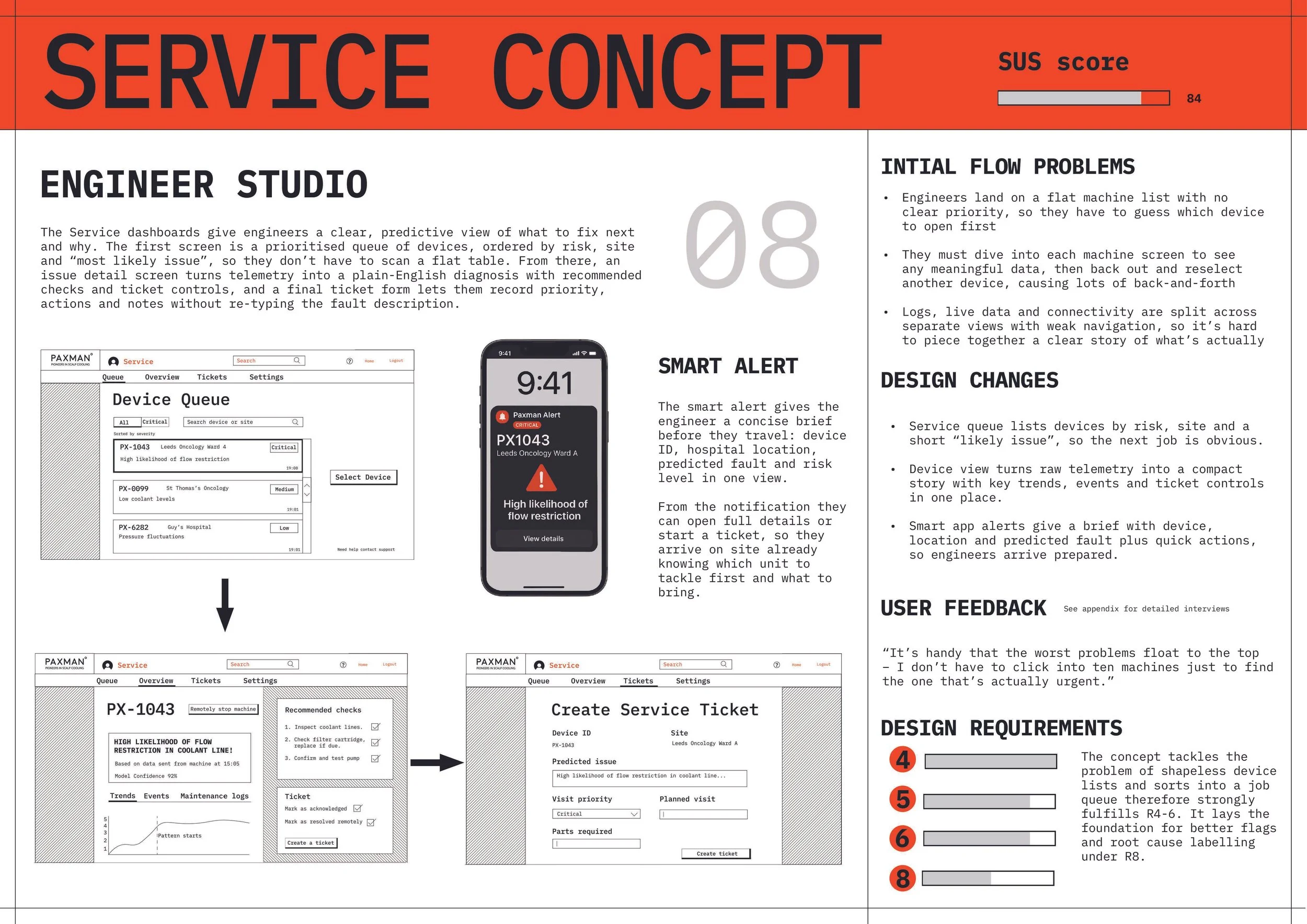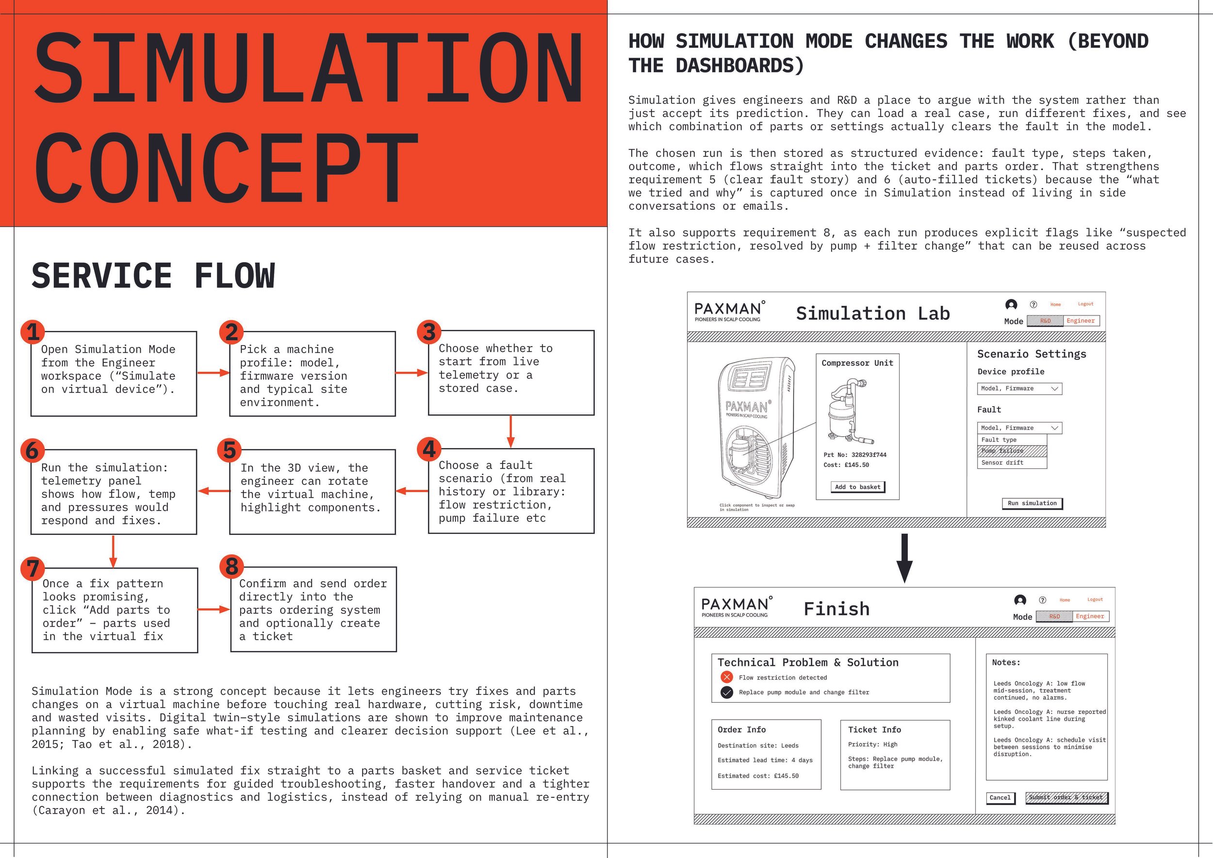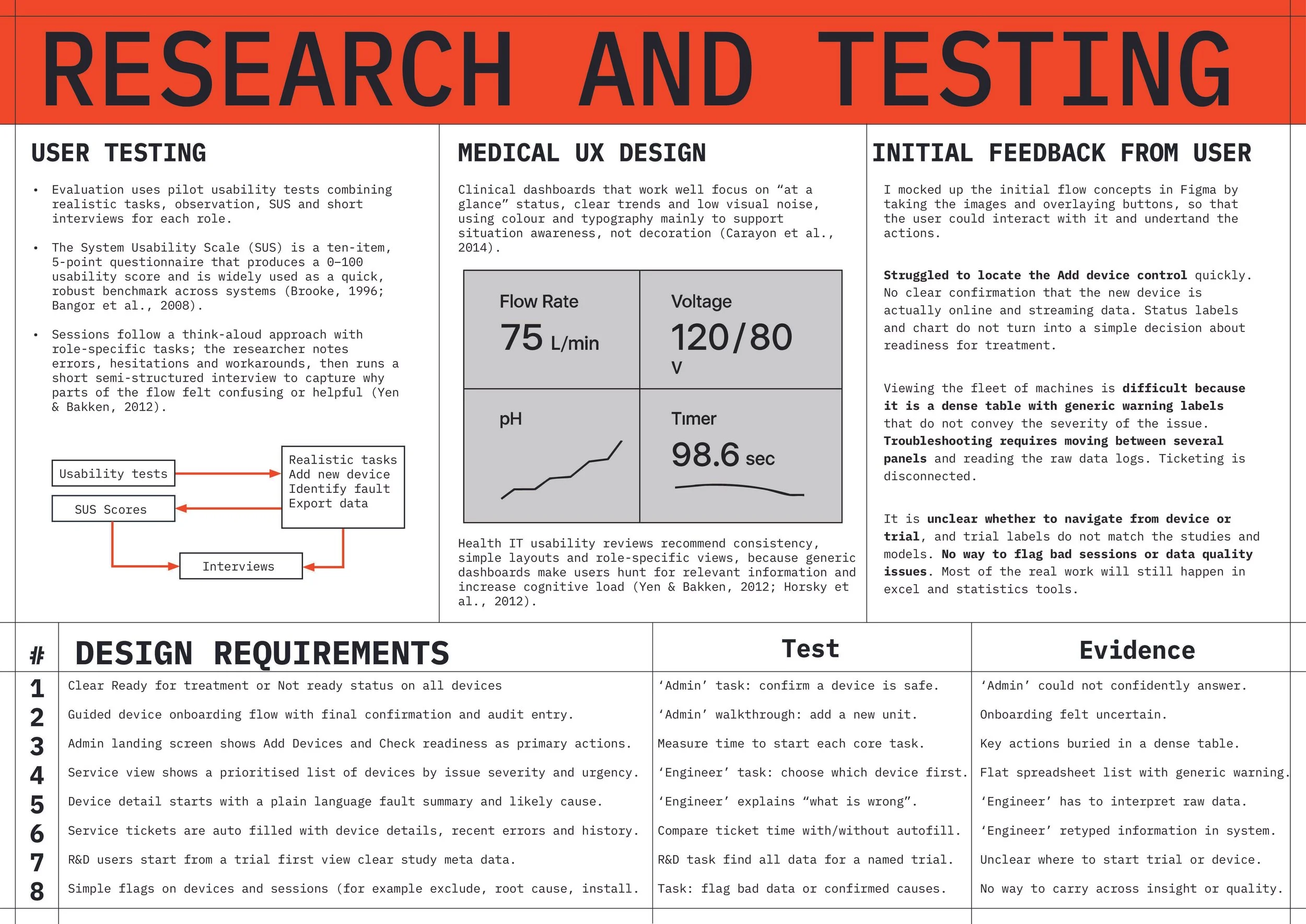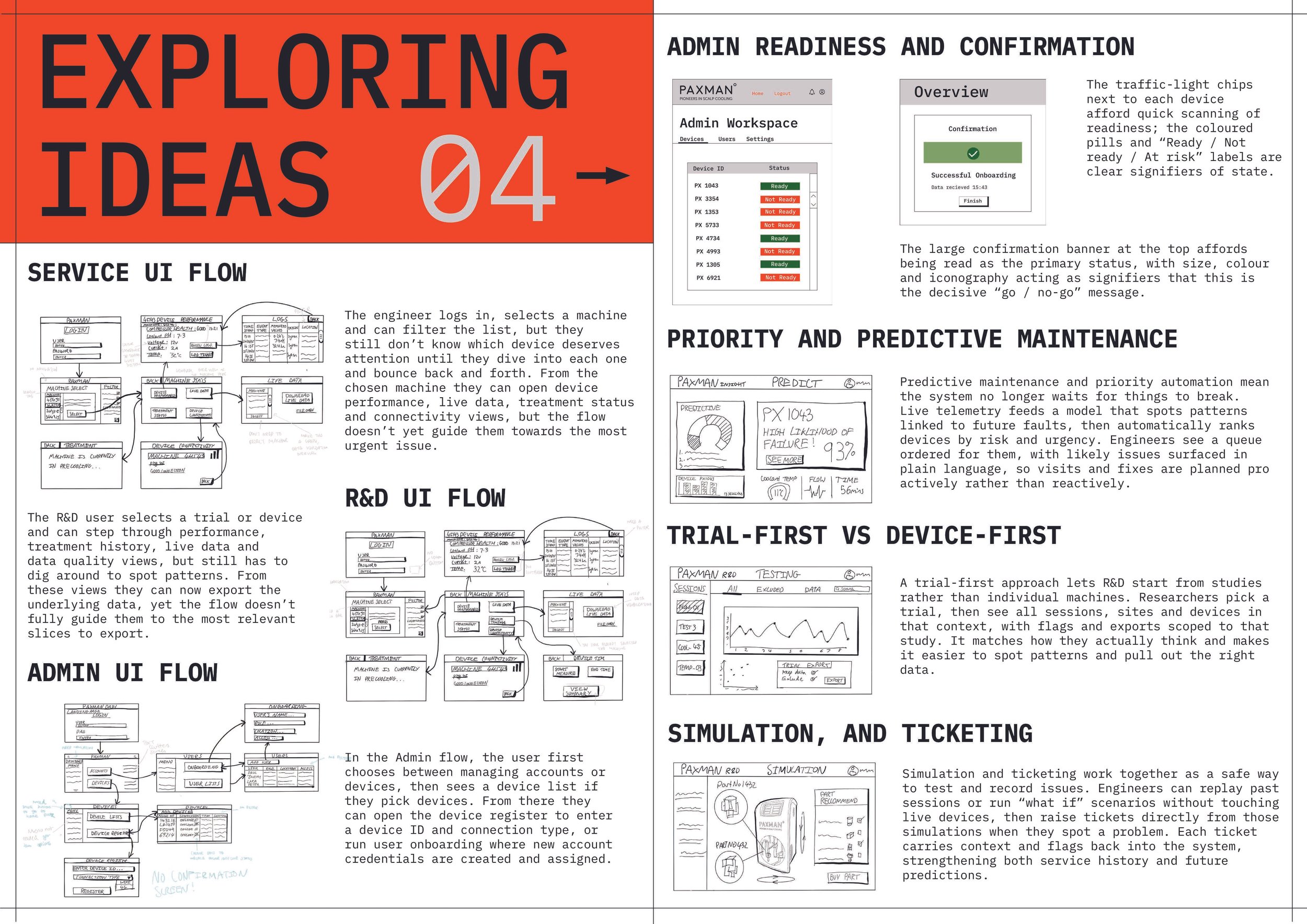 Engineers arrive blind, nurses compensate with inconsistent notes, and everyone pays for the disconnect in machine downtime and stress.I mapped journeys to expose failures at transitions, where errors often appear.Design exploration focused on readiness confirmation, priority automation, trial-first research, and ticketing as an integrated loop. A guided onboarding and confirmation flow that ends in a decisive “ready / not ready”, building confidence through strong state signifiers. Researchers start with studies, not machine IDs, then select sessions with live export summaries to protect data quality decisions. A prioritised queue and plain language fault story replace flat device lists, cutting back and forth navigation and speeding up fixes. A safe “what if” space links predicted faults to parts and tickets, tightening the loop between diagnosis, logistics, and recorded outcomesA Power Platform pipeline: telemetry into Dataverse, risk scoring, and automated alerts into Teams, so predictions land inside real work.