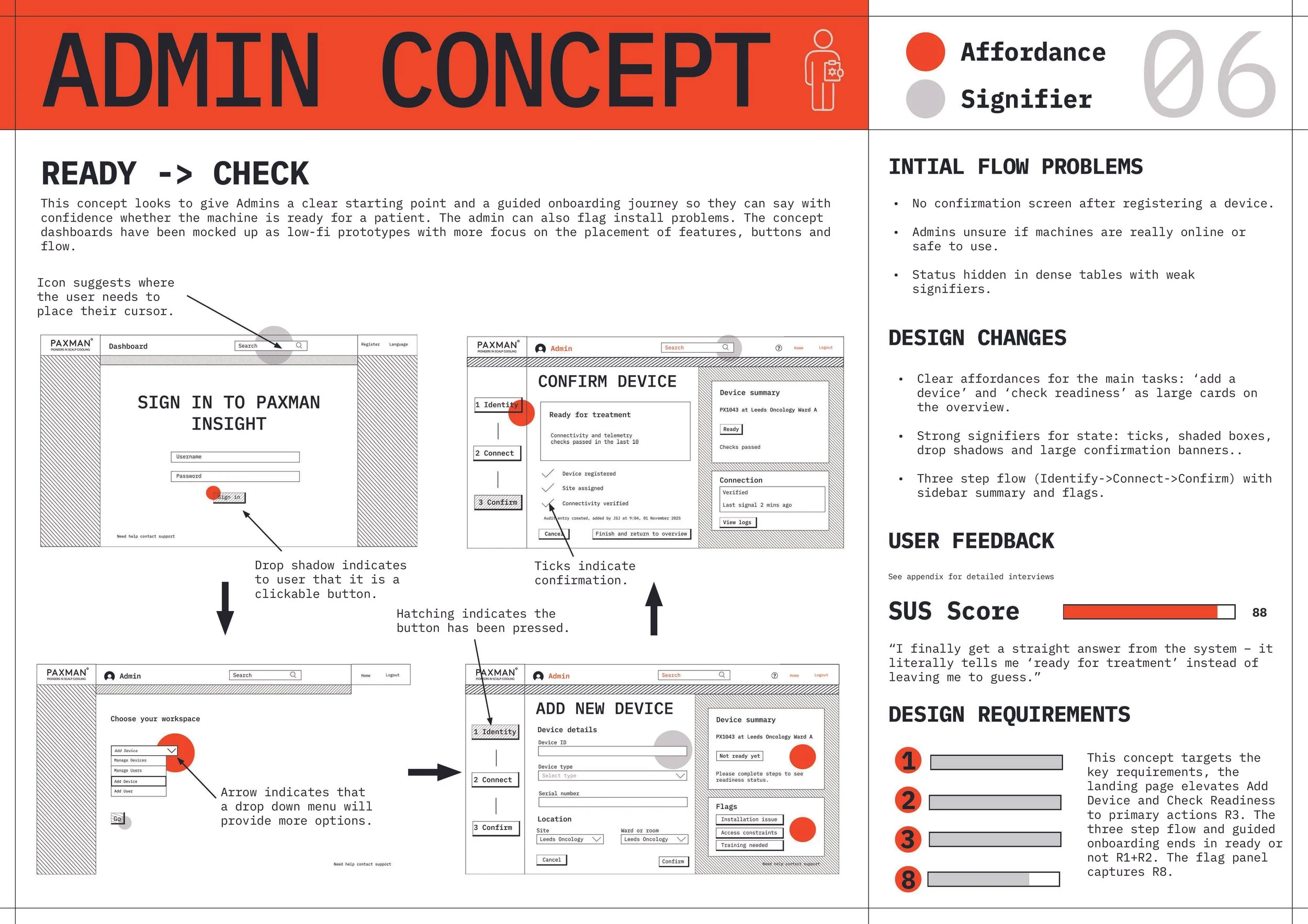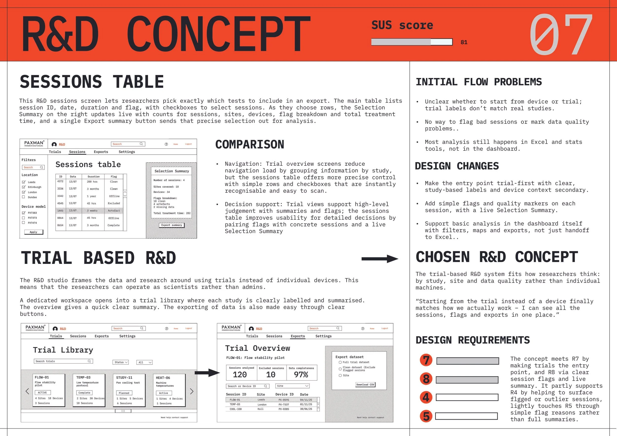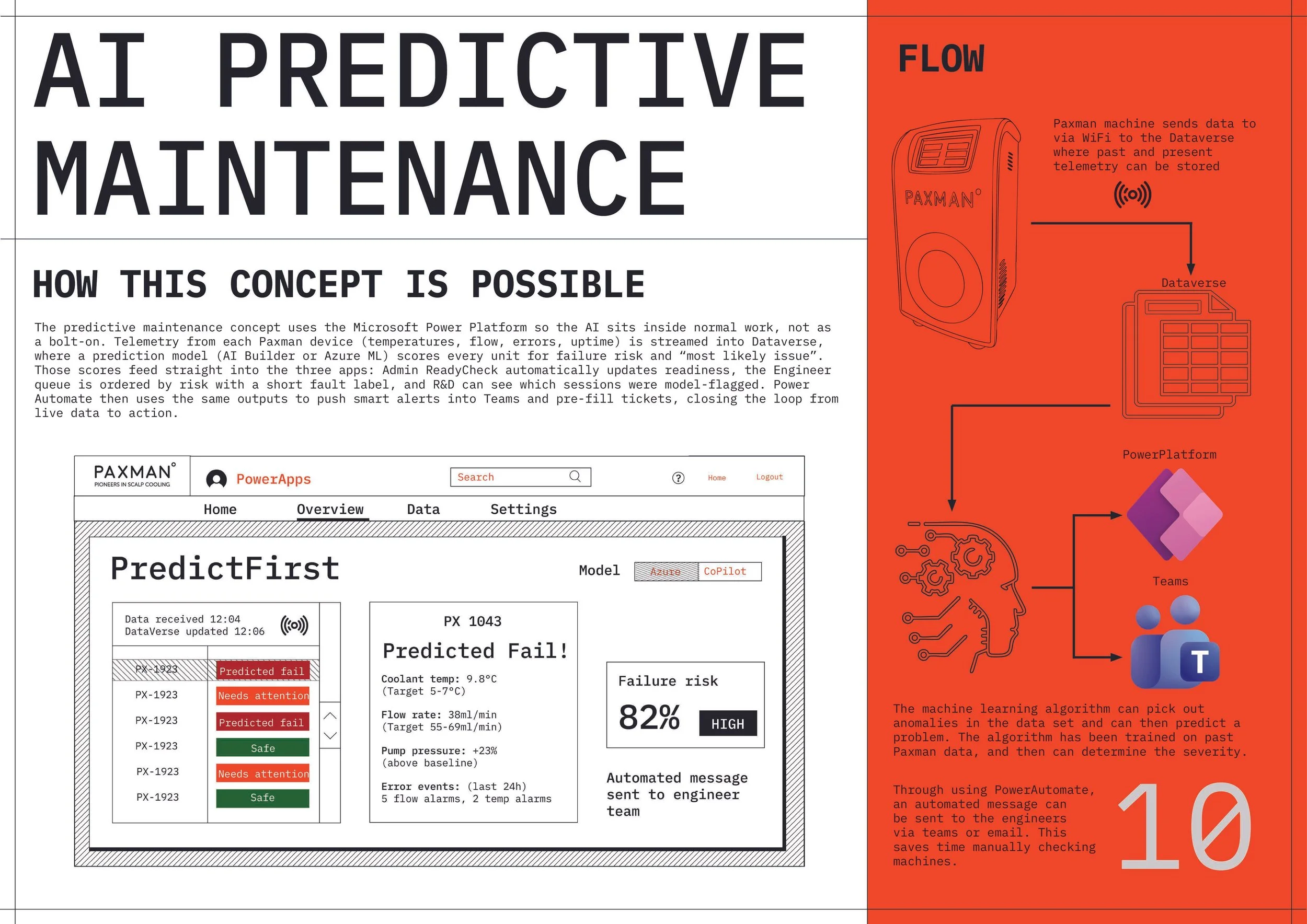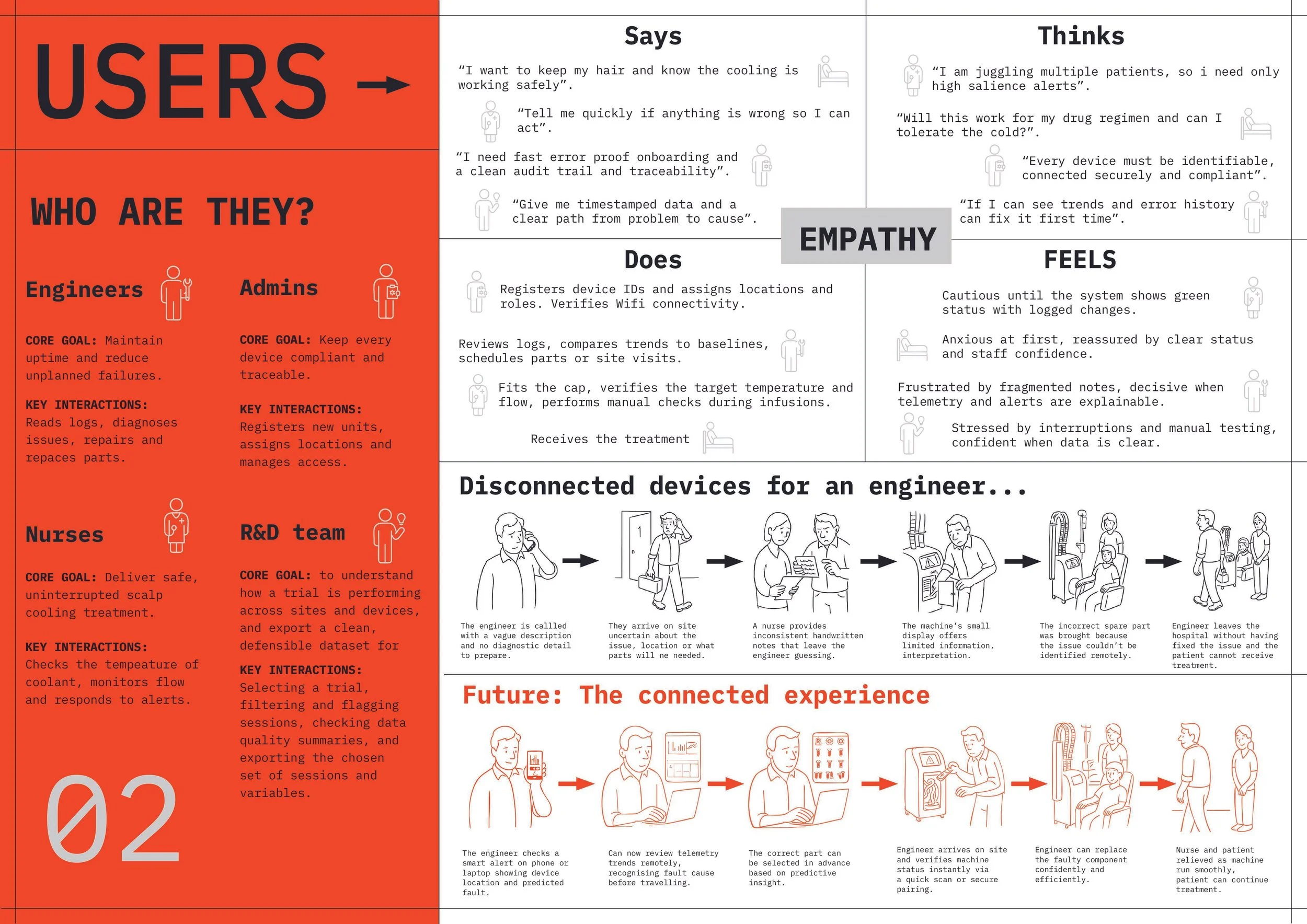 Engineers arrive blind, nurses compensate with inconsistent notes, and everyone pays for the disconnect in machine downtime and stress.I mapped journeys to expose failures at transitions, where errors often appear.Design exploration focused on readiness confirmation, priority automation, trial-first research, and ticketing as an integrated loop. A guided onboarding and confirmation flow that ends in a decisive “ready / not ready”, building confidence through strong state signifiers. Researchers start with studies, not machine IDs, then select sessions with live export summaries to protect data quality decisions. A prioritised queue and plain language fault story replace flat device lists, cutting back and forth navigation and speeding up fixes. A safe “what if” space links predicted faults to parts and tickets, tightening the loop between diagnosis, logistics, and recorded outcomesA Power Platform pipeline: telemetry into Dataverse, risk scoring, and automated alerts into Teams, so predictions land inside real work.