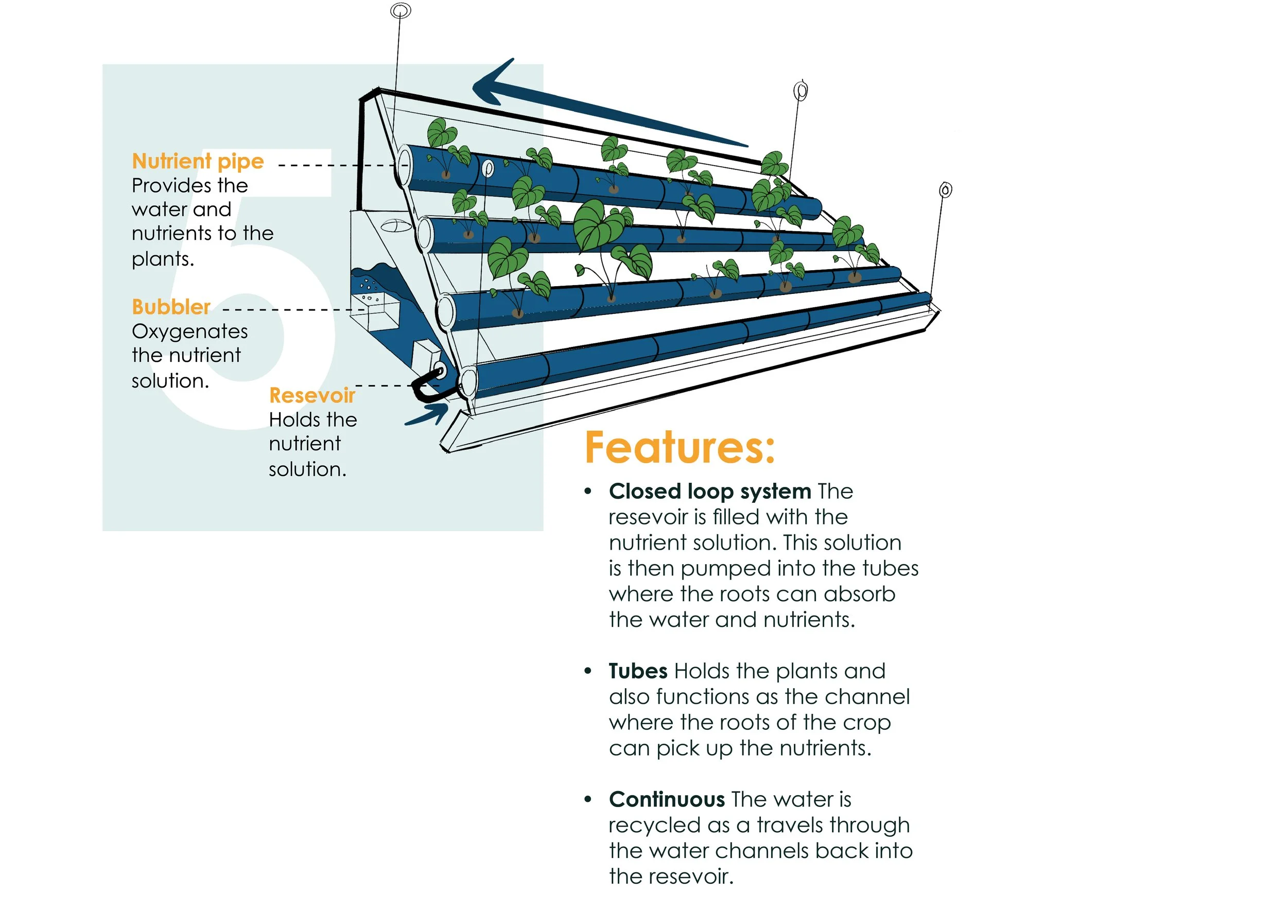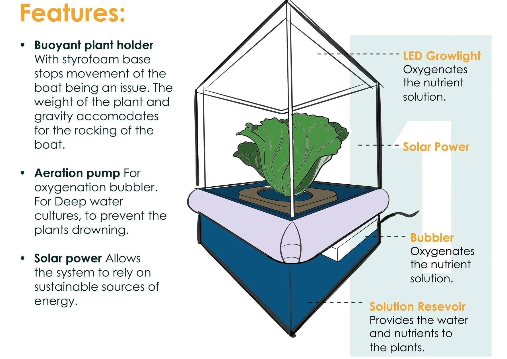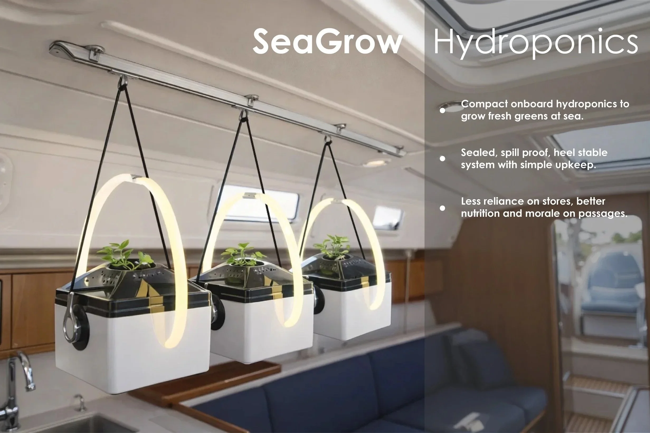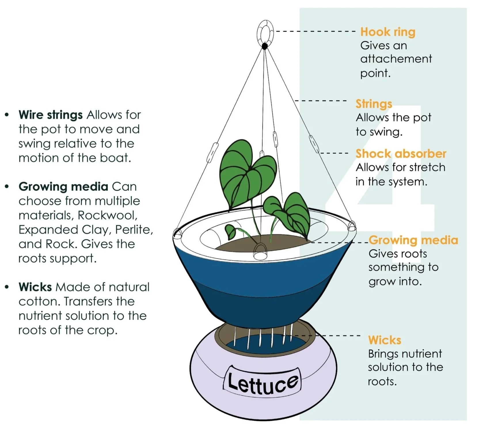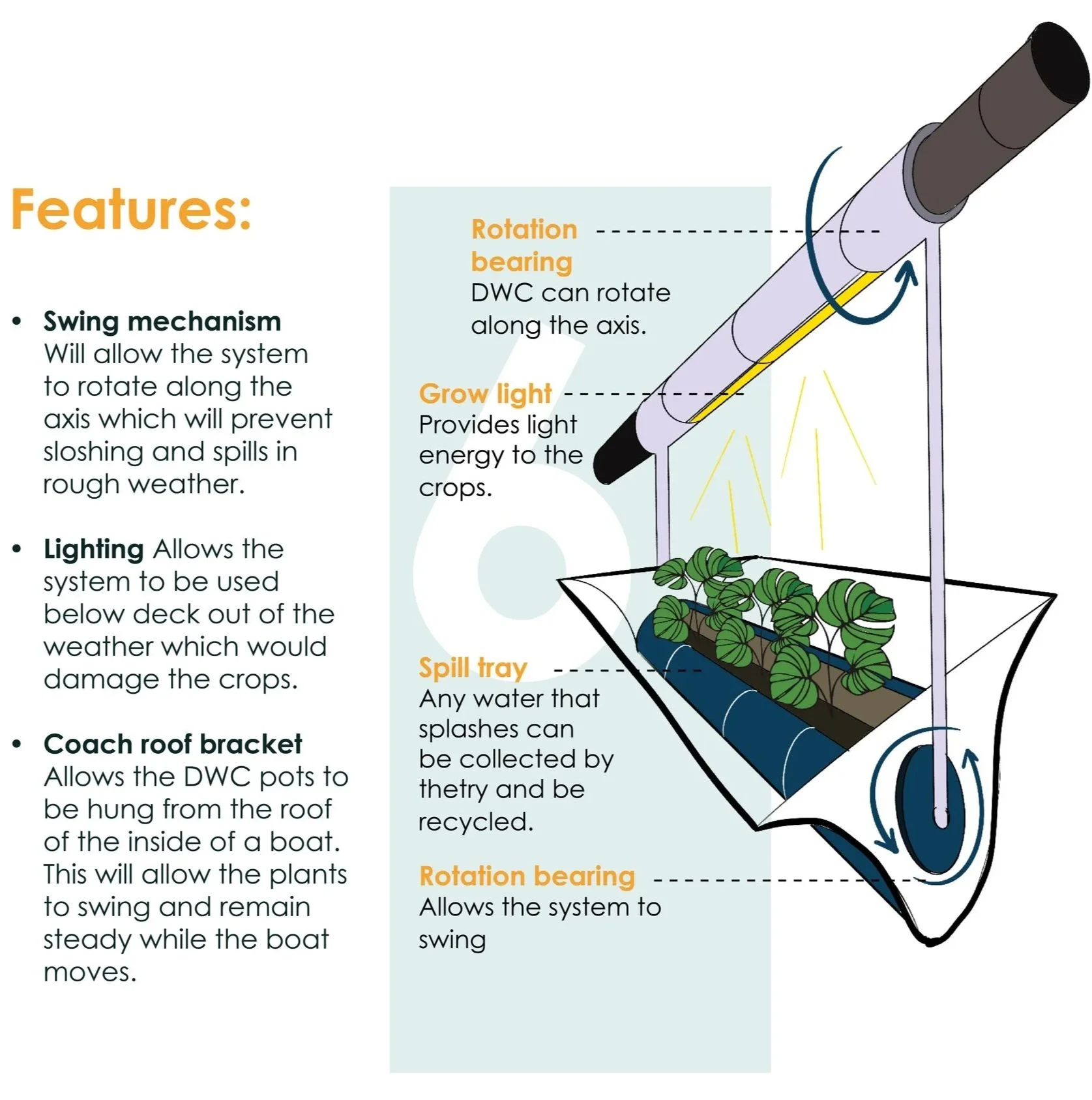 The solution was to develop a hydroponic system that uses very little precious water while withstanding the harsh marine environment, limited light below deck, and constant movement of the boat.
