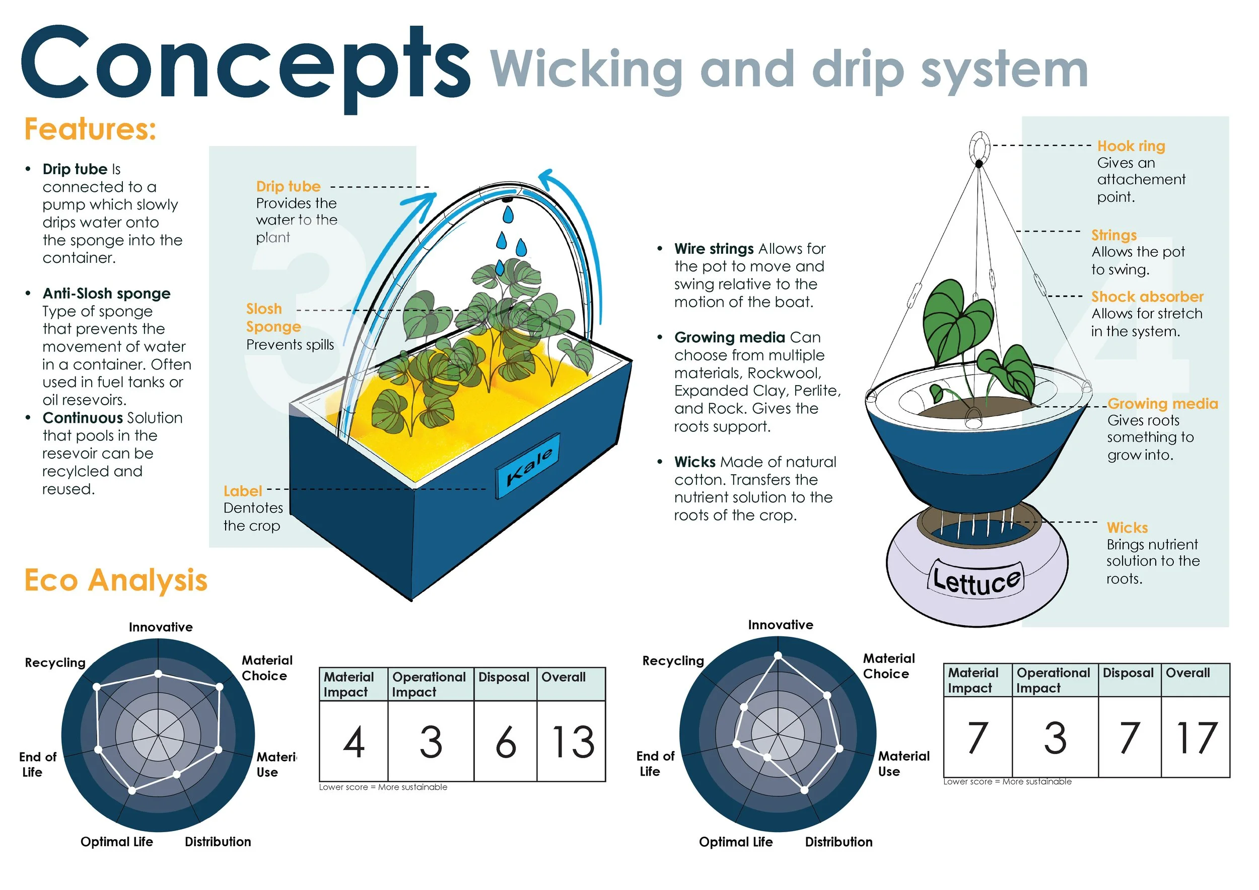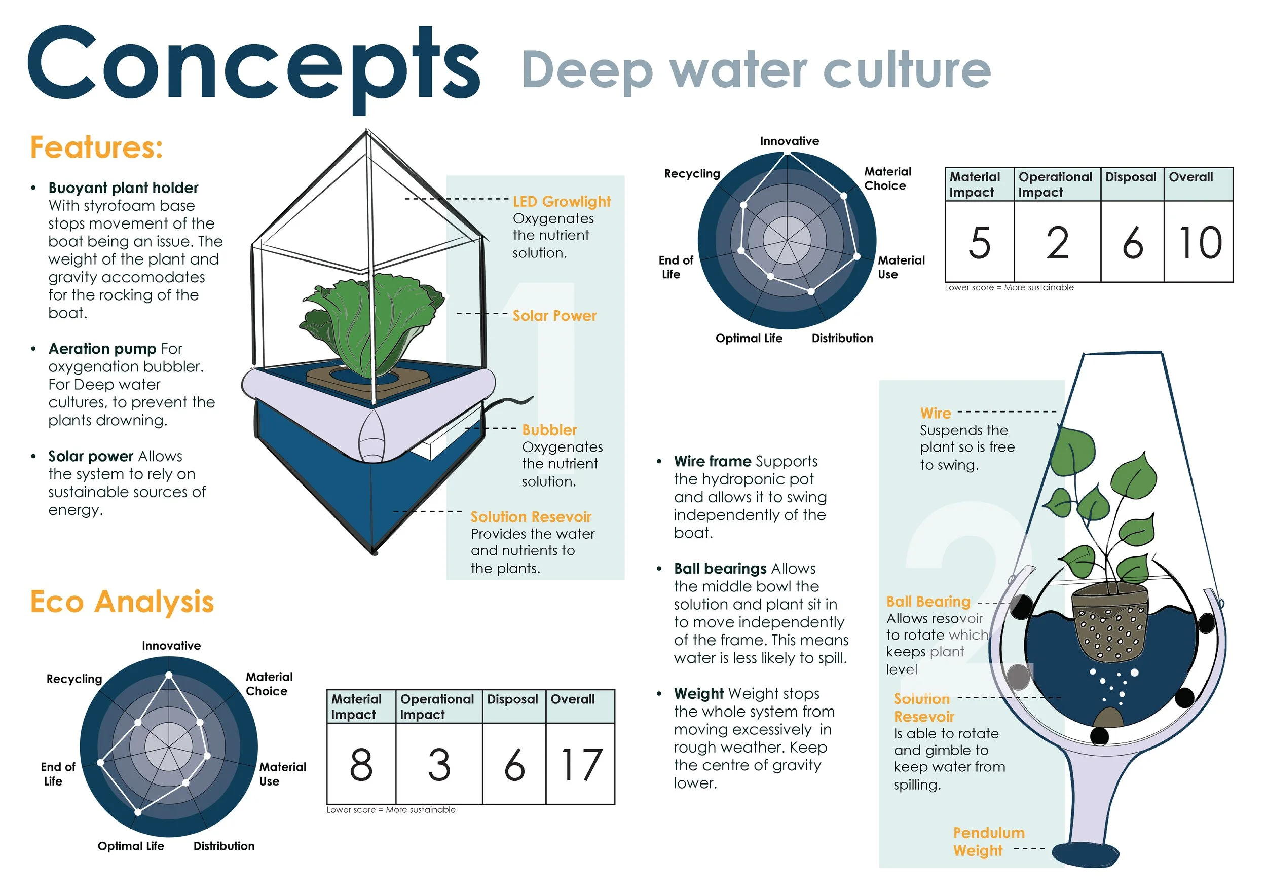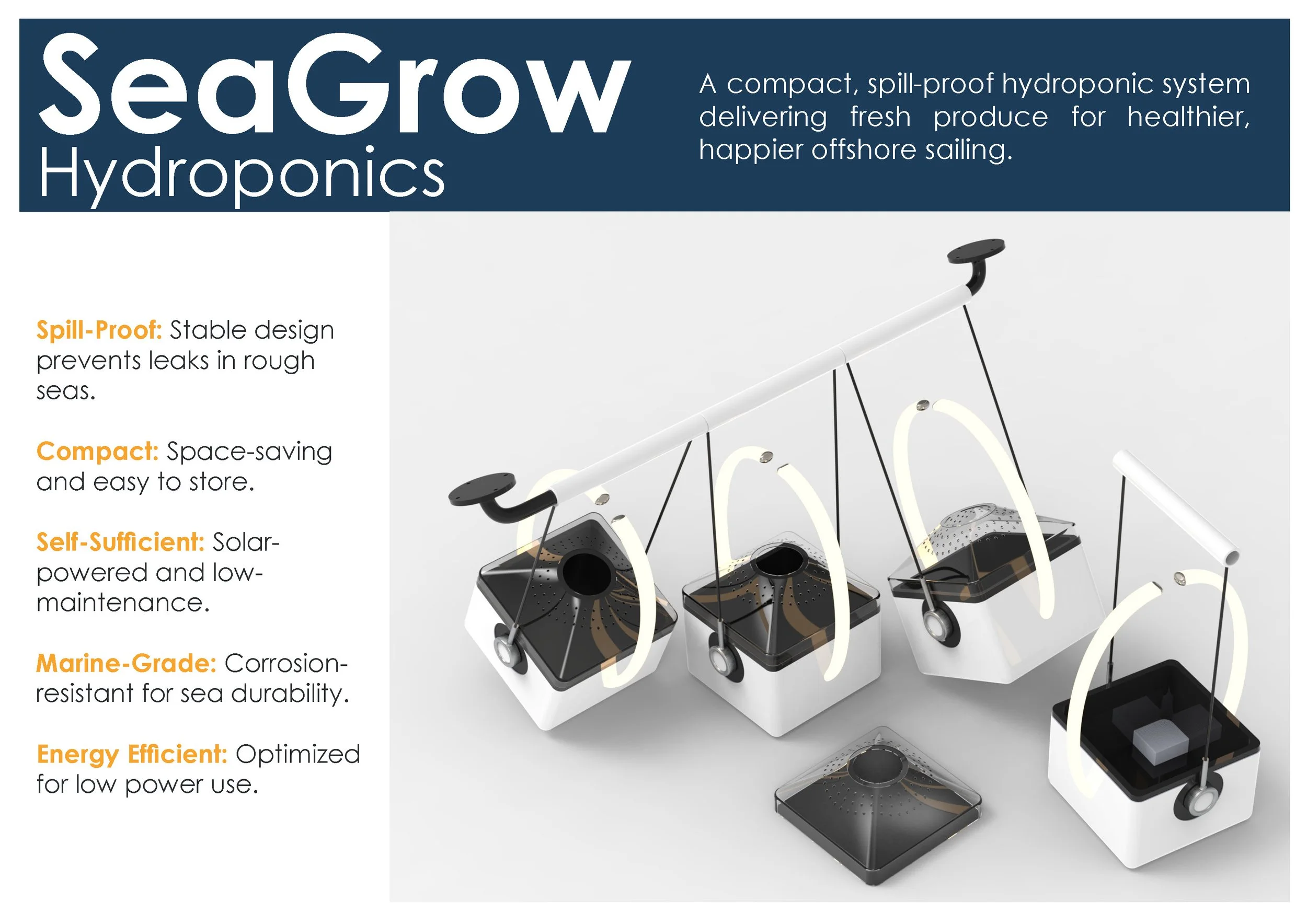 I developed a Deep Water Culture system supported by a swing-stabilised modular frame to prevent spills at sea. The design incorporates solar-powered, compact pods with low-maintenance components and an intuitive user experience, featuring grow lights and simple monitoring.