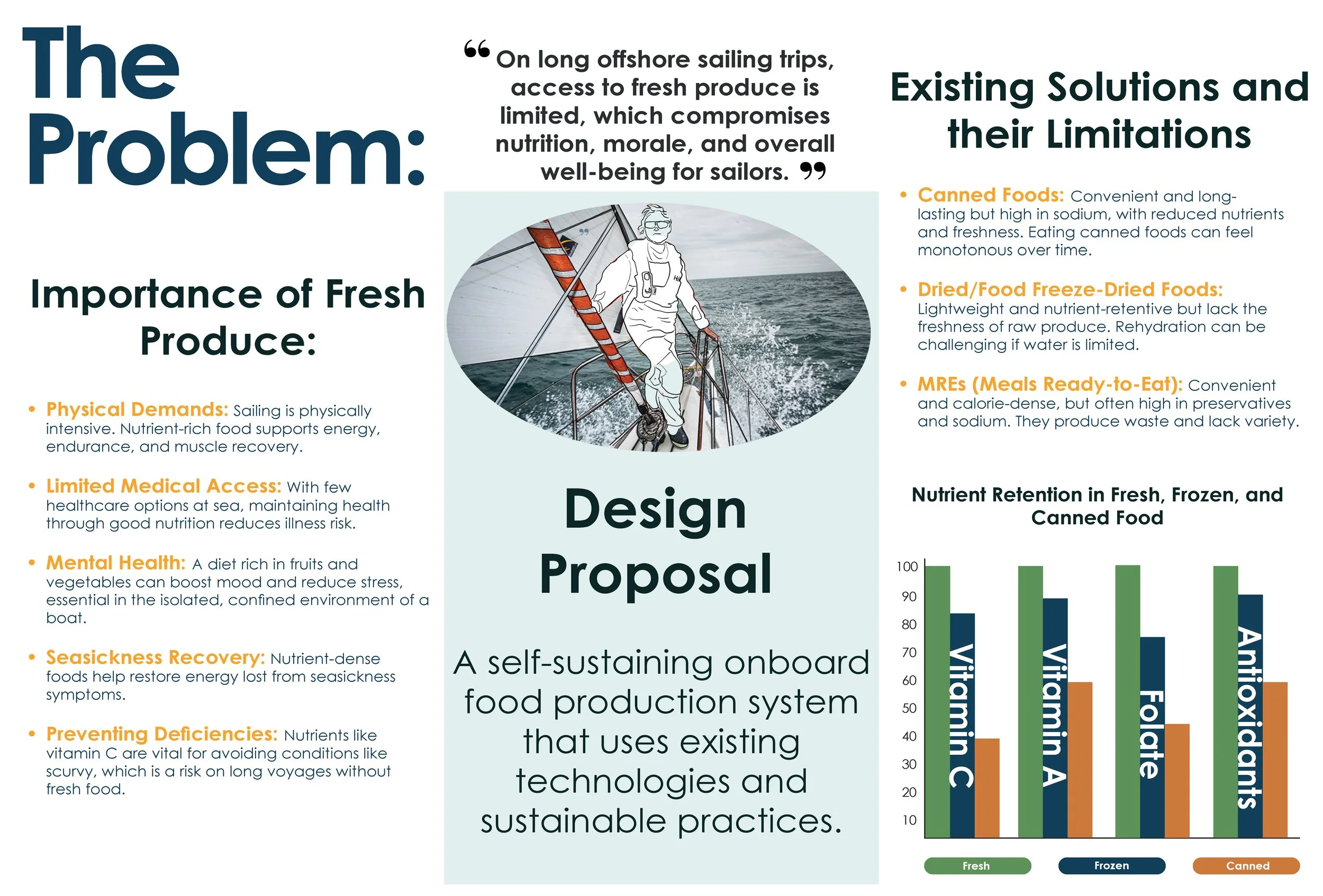 Through the lens of the Four Pleasures, I identified key needs relating to health, mindset, crew cohesion, and sustainability. Current reliance on canned and freeze-dried provisions lacks essential nutrients, freshness, and variety, further reinforcing the need for change.